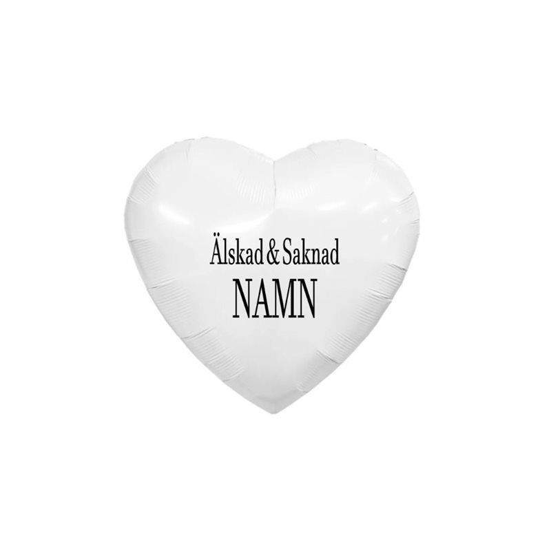 En vacker och stilren hjärtformad folieballong i vitt, med texten Älskad & Saknad i svart vinyl samt valfritt namn. En fin och personlig dekoration till minnesstund, begravning eller för att hedra någon som står dig varmt om hjärtat.