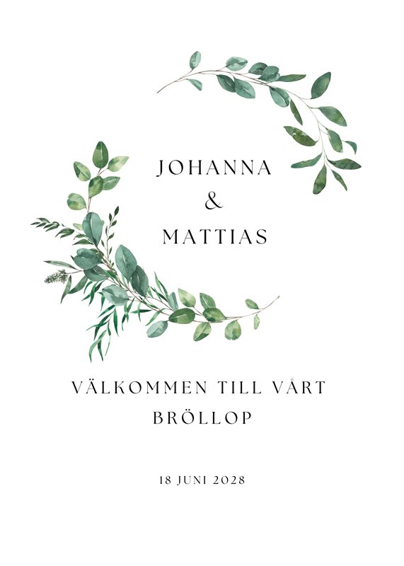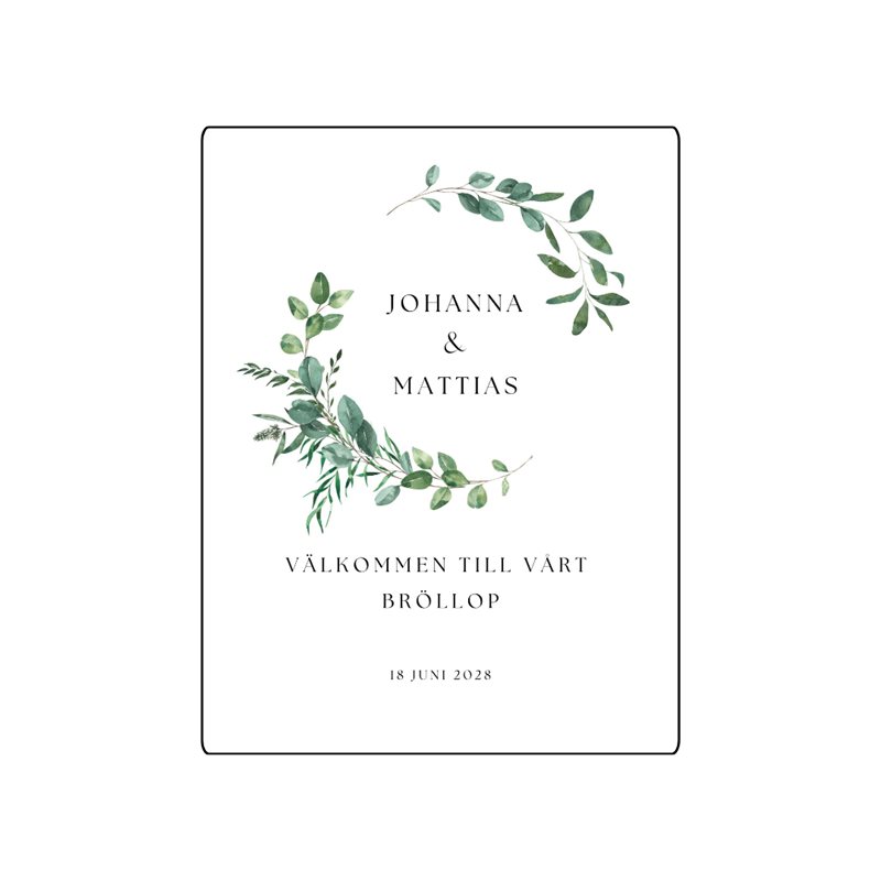 Personlig välkomstskylt med grön krans av växter som passar till både fest, bröllop, födelsedag och dop. Du väljer själv texten så att den passar till just din tillställning. Du kan även bestämma fägen på texten men vi kan tyvärr inte erbjuda tryck i metallicfärger. Typsnittet är samma som på bilden.